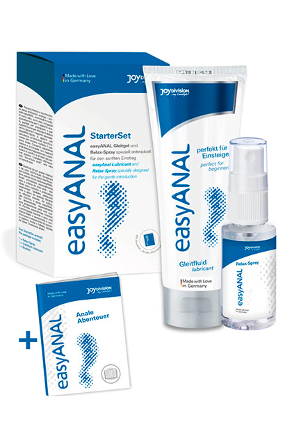 EasyAnal StartedSet представляет собой набор, состоящий из: 30 мл расслабляющего спрея, 80 мл смазки для скольжения и брошюры.