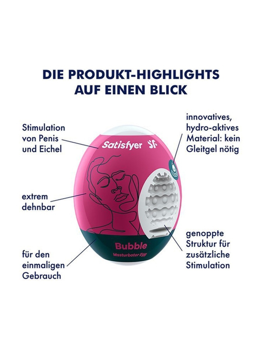Мастурбатор-яйцо Satisfyer Bubble Masturbator Egg всегда будет под рукой! Благодаря сдержанному дизайну эти изделия с яйцевидной формой идеально подходят для быстрого решения проблемы на ходу. Яйца изготовлены из инновационного материала — это гибкий, гидроактивный термопластичный эластомер, который можно смочить небольшим количеством воды или слюны, что дарит непревзойденное наслаждение и ощущение гладкости. Для получения максимального удовольствия смазка даже не нужна.